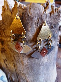 These eye earrings are made from textured nickel silver with a stylized copper iris. The eye portion is just over an inch at the widest point. The eye hangs from three brass jump rings attached to a textured brass triangle. The ear wires are sterling silver. The earrings are two inches long from the top of the ear wire to the bottom of the eye. The eye is a symbol of protection in many cultures. It is a spiritual symbol connected to the divine. The eye is even on the dollar bill.