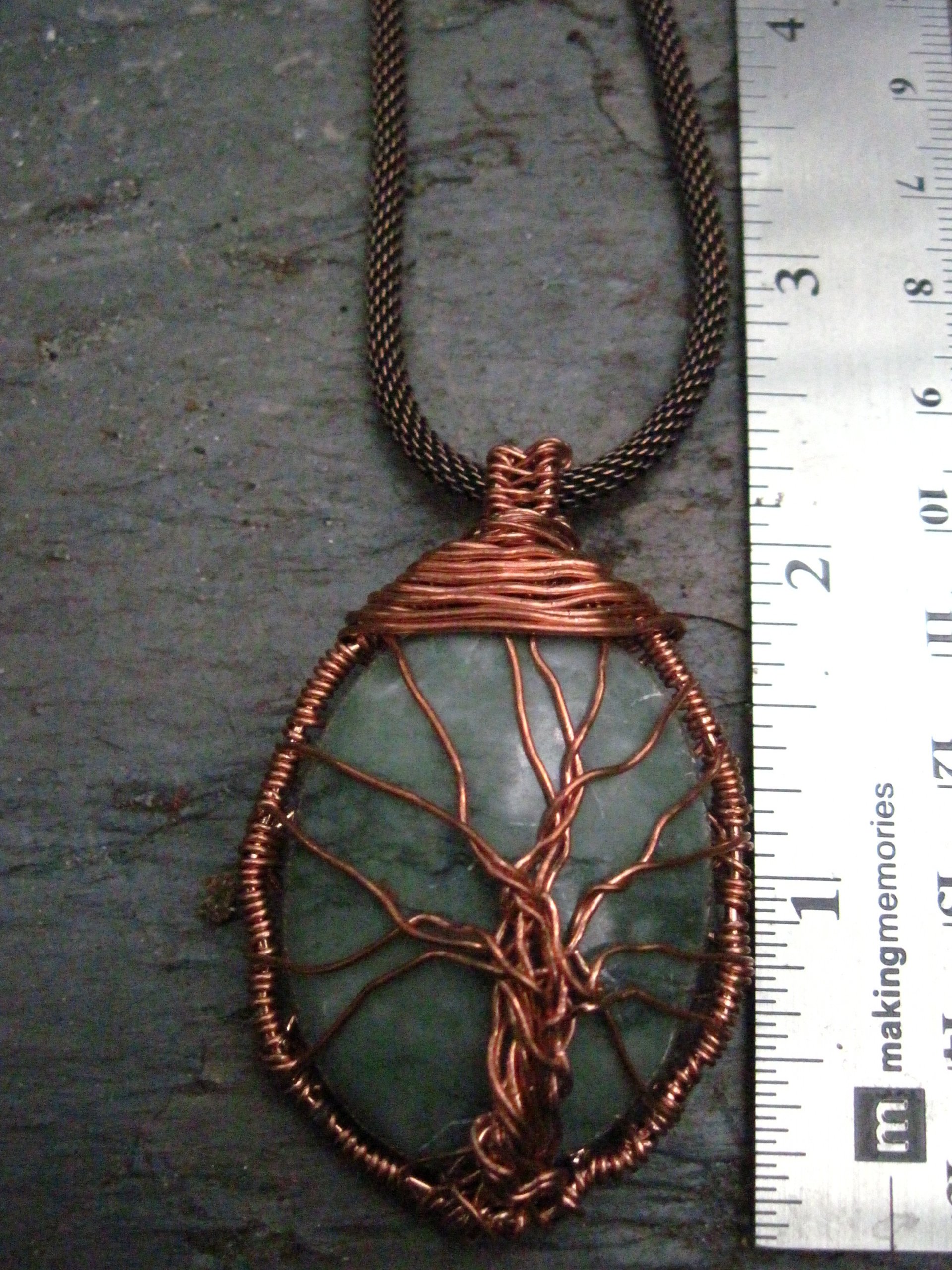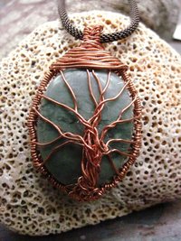 An aventurine cabochon has been wire wrapped with copper wire to make this tree of life pendant. The tree of life is a spiritual symbol in many cultures as the roots reflect the branches so "as above so below," or "on earth as it is in heaven."