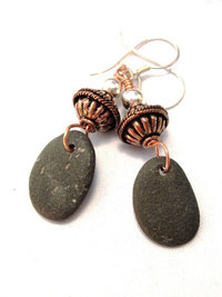 Black beach pebbles from Oregon coast topped are topped with copper and sterling beads to make these natural rock earrings which I call OM rock. Ear wires are sterling silver and total length of earring from ear wire to bottom is 2 and a half inches.
