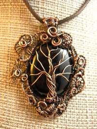 This tree of life with a twist is a large bold and powerful statement necklace. I combined a swirling wirewoven frame around the traditional tree of life. The black onyx cabochon is large measuring one and three quarters inches by one and a quarter inches. The tree covers the front of this cab and has been antiqued to give it depth. The pendant measures three inches from the top of the bail to the bottom of the swirls. It is about two inches at the widest point.