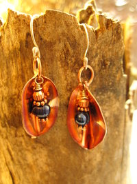 Dangle earrings are forged and folded copper. The earrings are in a pea pod shape and have a copper bead and blue pearl hanging inside the earring. The copper has a fire patina. They hang from a sterling silver earwire. All components are made by me.
