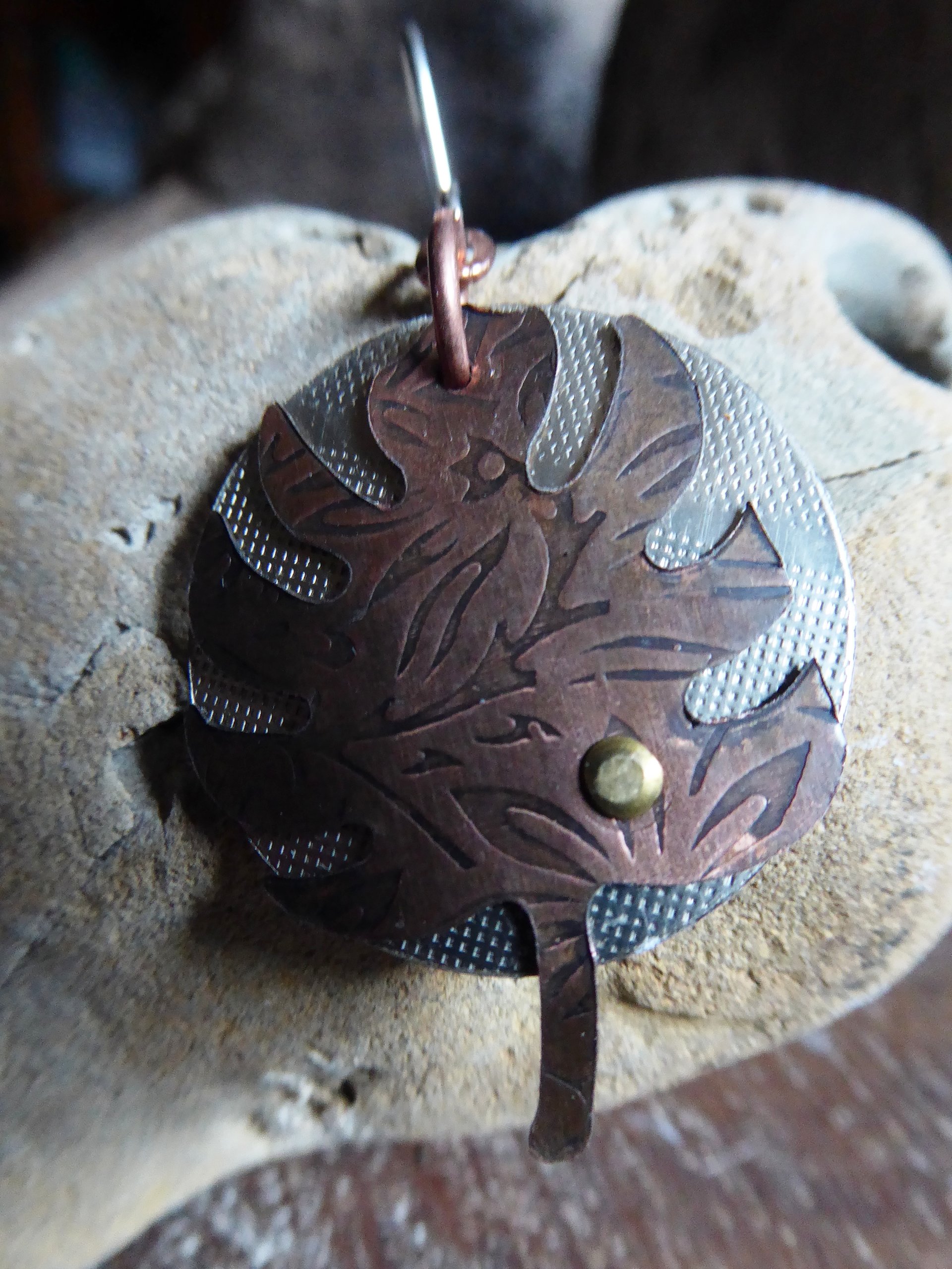 Stylized copper leaf has been made from textured bench scraps. This leaf has been cold connected to a nickel silver disc. The earrings dangle from a copper chain which is connected to a sterling ear wire.