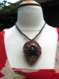 This mixed metal copper pendant has been heated and hammered to make a cocoon to showcase a large rquoise nugget. The pendant is made by foldforming and has a German silver circular piece adorned with copper hearts at the base. The fire patina has been left on the cocoon so ther are some reds in the copper. The pendant is large being about three inches in length and over two inches in width. The turquoise nugget swings inside the pendant from a copper headpin.