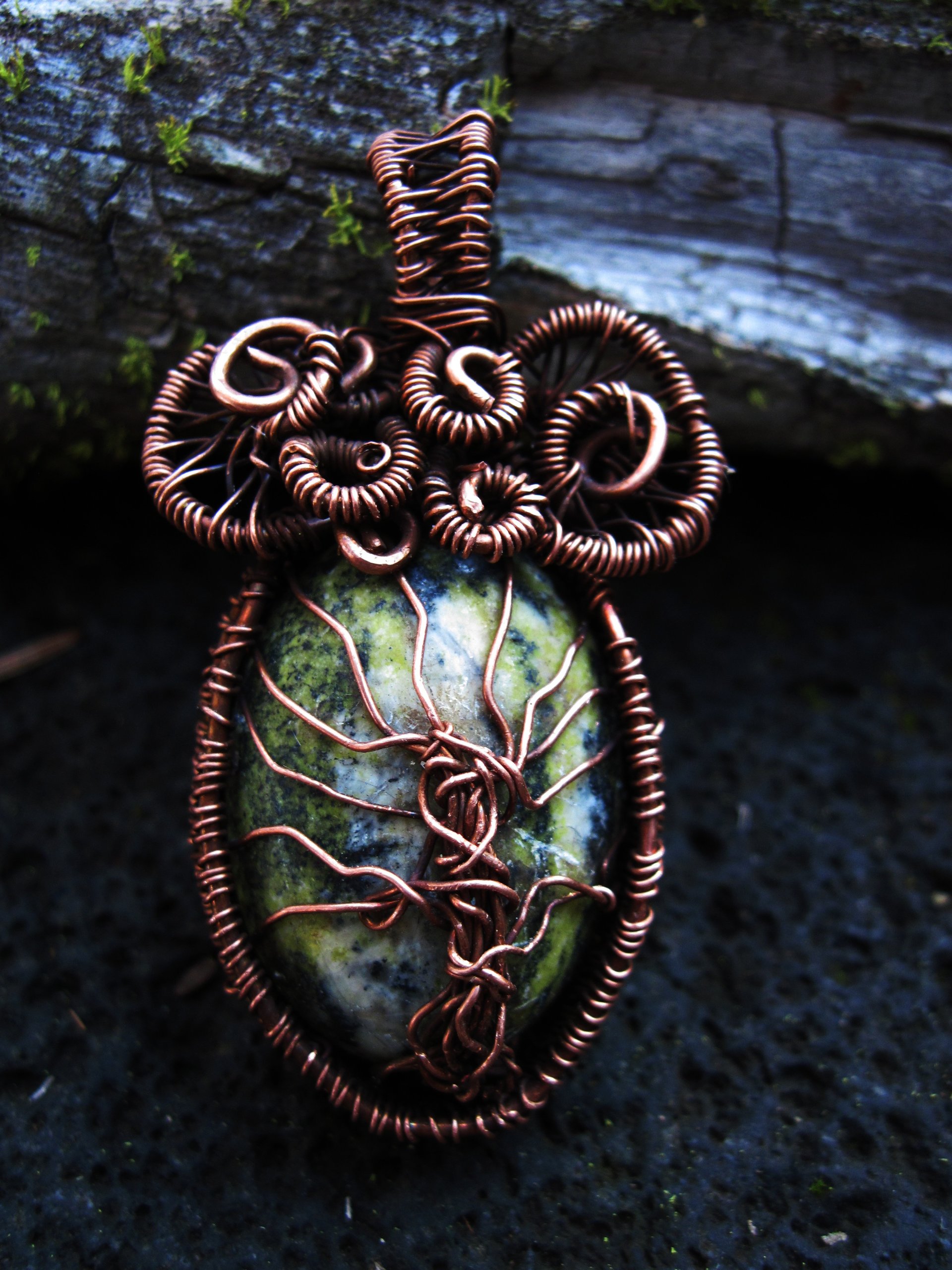 A mottled green cabochon was wire wrapped with copper in a tree of life design. The outside of the stone has been wire woven and finished with a swirling design by the bail. The stone is one and a half inches by one inches. With the wire wrap bezel the pendant is two and a quarter inches from the top of the bail to the bottom. The widest section which is the swirls is an inch and a quarter.