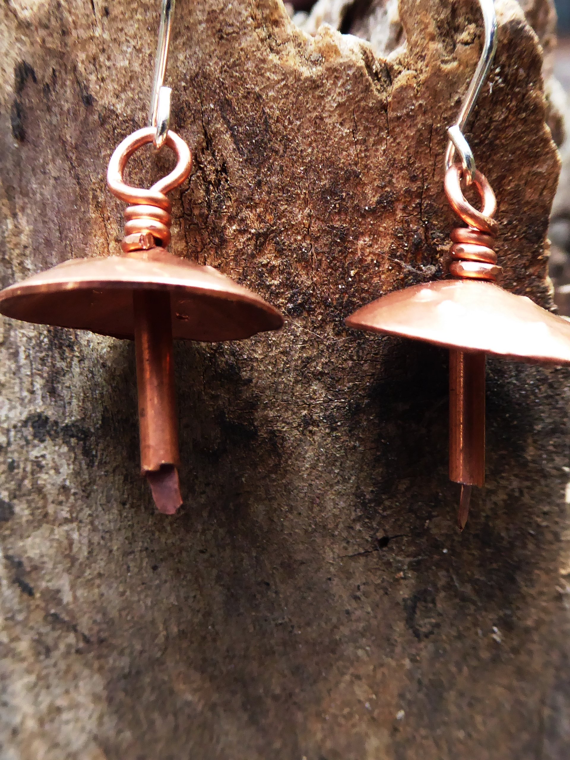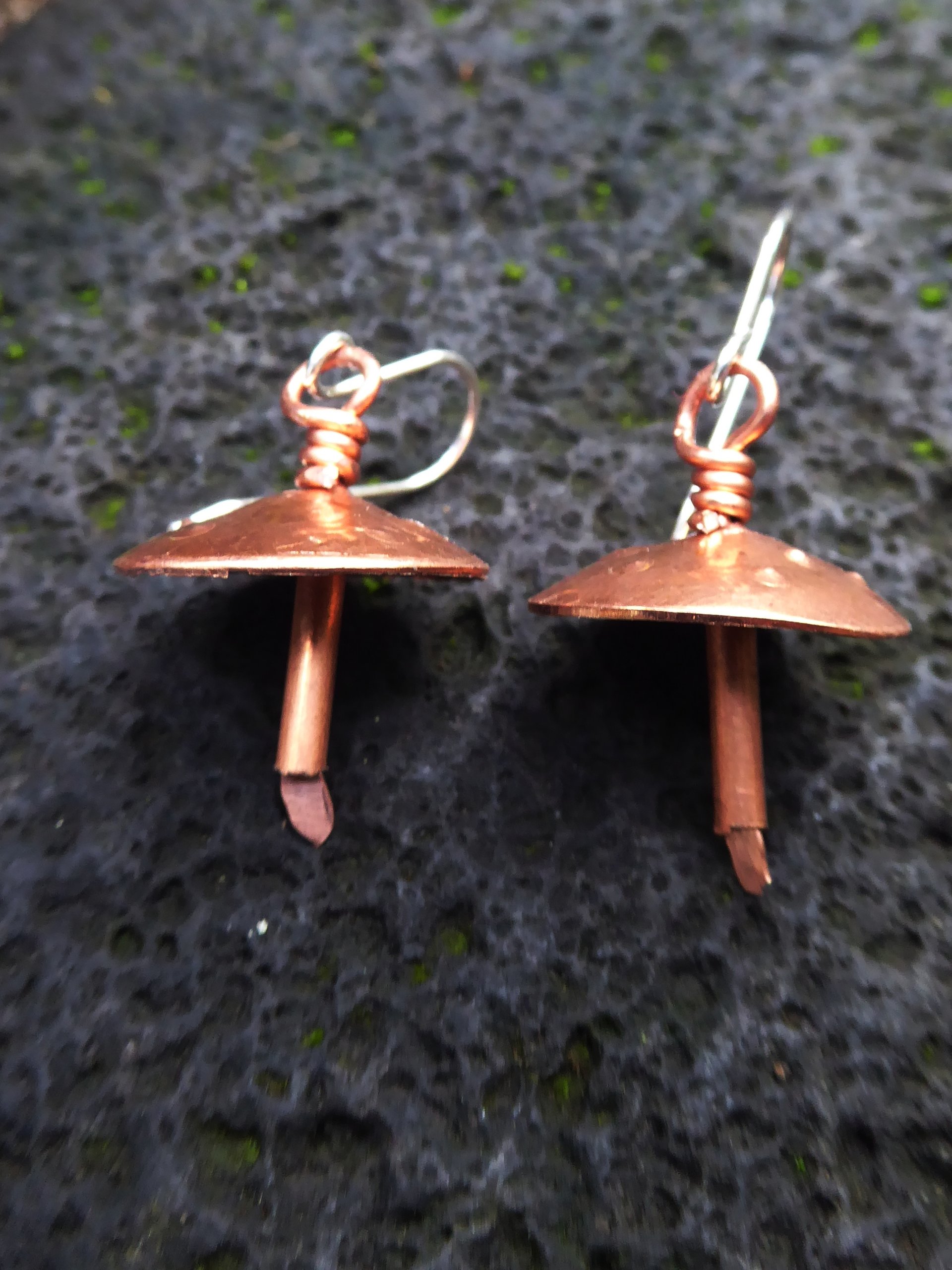 As to the earrings, they are made of copper bench scraps and recycled wire. The earrings dangle from a sterling silver ear wire. The half inch discs are misshapen and have bumps on them similar to mushrooms you might see in the woods. From the top of the earwire to the bottom of the stem is an inch and a half.