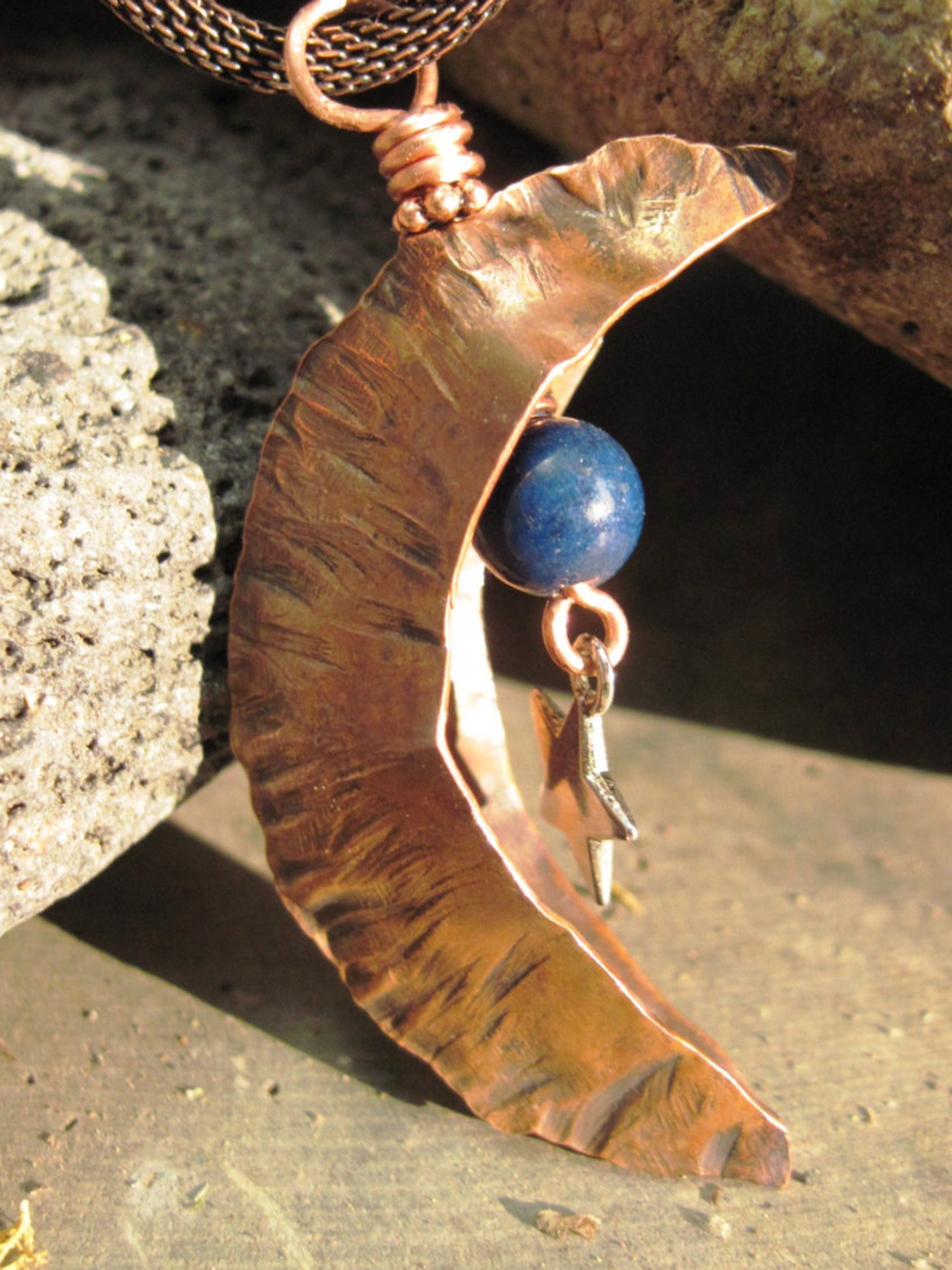 Fold form copper crescent moon pendant has a lapis bead and silvertone star inside. This is a forged piece of jewelry with a nice heat patina. The moon is about two inches in length. The lapis bead and star dangle inside the moon so they move around. The pendant hangs from a mesh chain which has a two inch extension chain and a lobster clasp. You have two lengths from which to pick