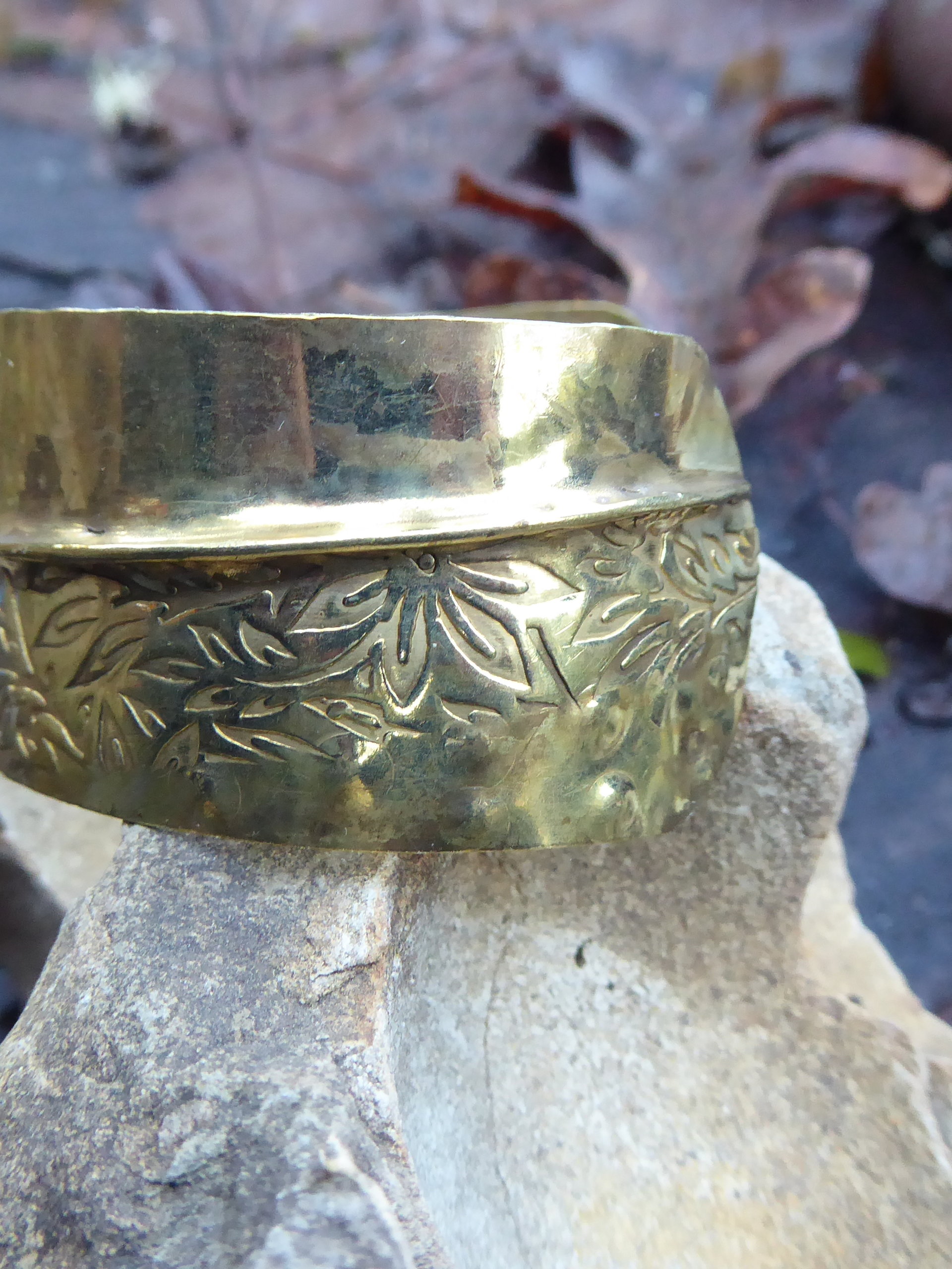 Jewelers bronze also known as brass has been heated, hammered, folded and forged to make this cuff bracelet.  The fold runs at an angle and one size of the fold is textured and the other side slightly hammered into shape.  Fold forming requires heating the metal and forming it then annealing it again so it takes a few steps to make this cuff.