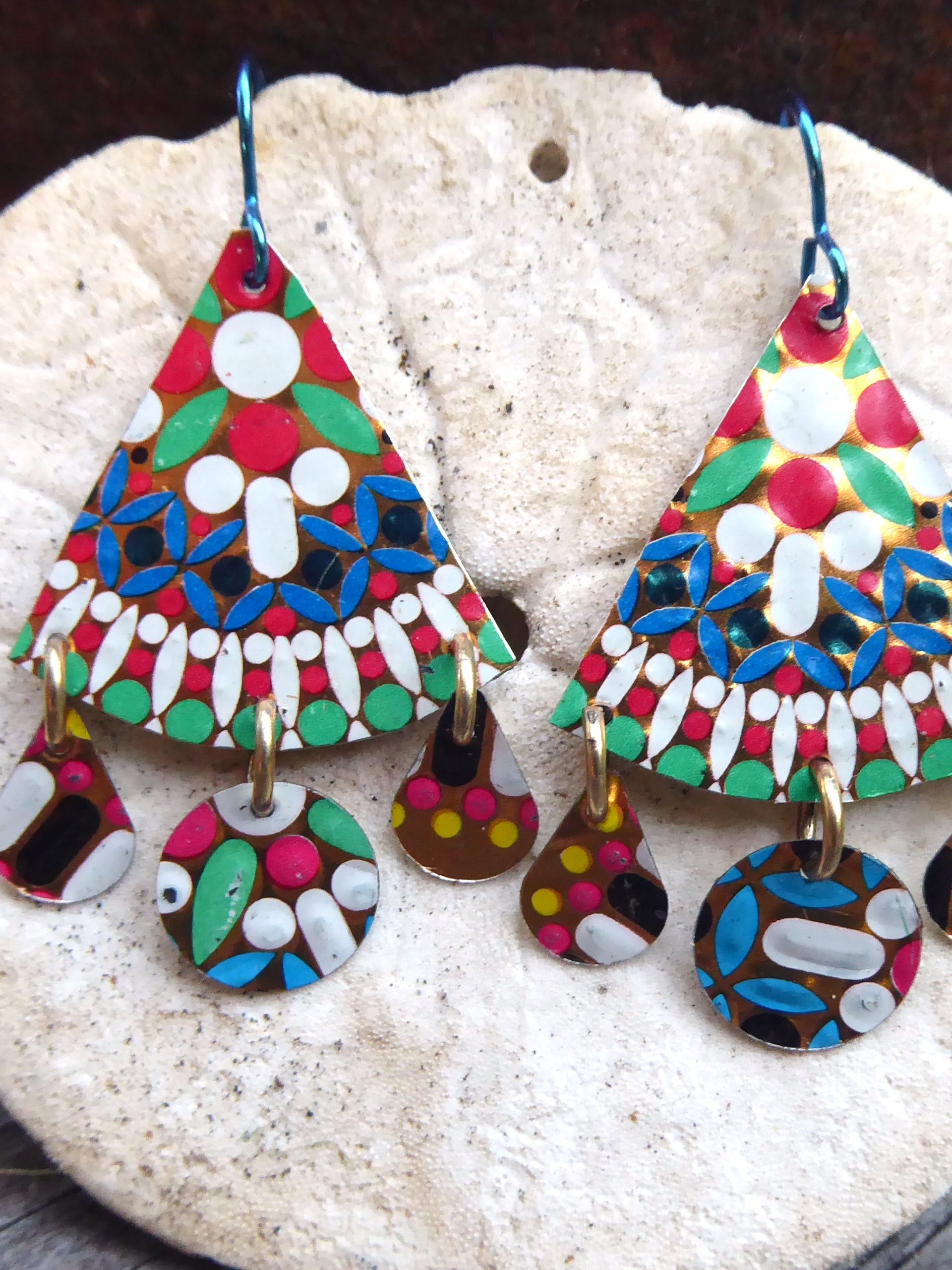 These earrings will go with just about anything as there are so many colors. The earring is a made from a vintage tin that had begun to rust. All the components are from the same tin. There is a large triangular piece with three dangles hanging from brass jumprings. The triangular piece is slightly over an inch. With the ear wire and dangles the total length is two and a quarter inches.