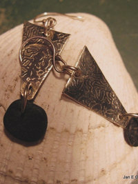These beach rock earrings have a small pebble hooked to a triangular piece of German silver. The rock was gathered by me on a beach in Oregon. The metal piece was also handmade by me and has a swirly texture on it. The rock is attached to the metal with a jump ring.