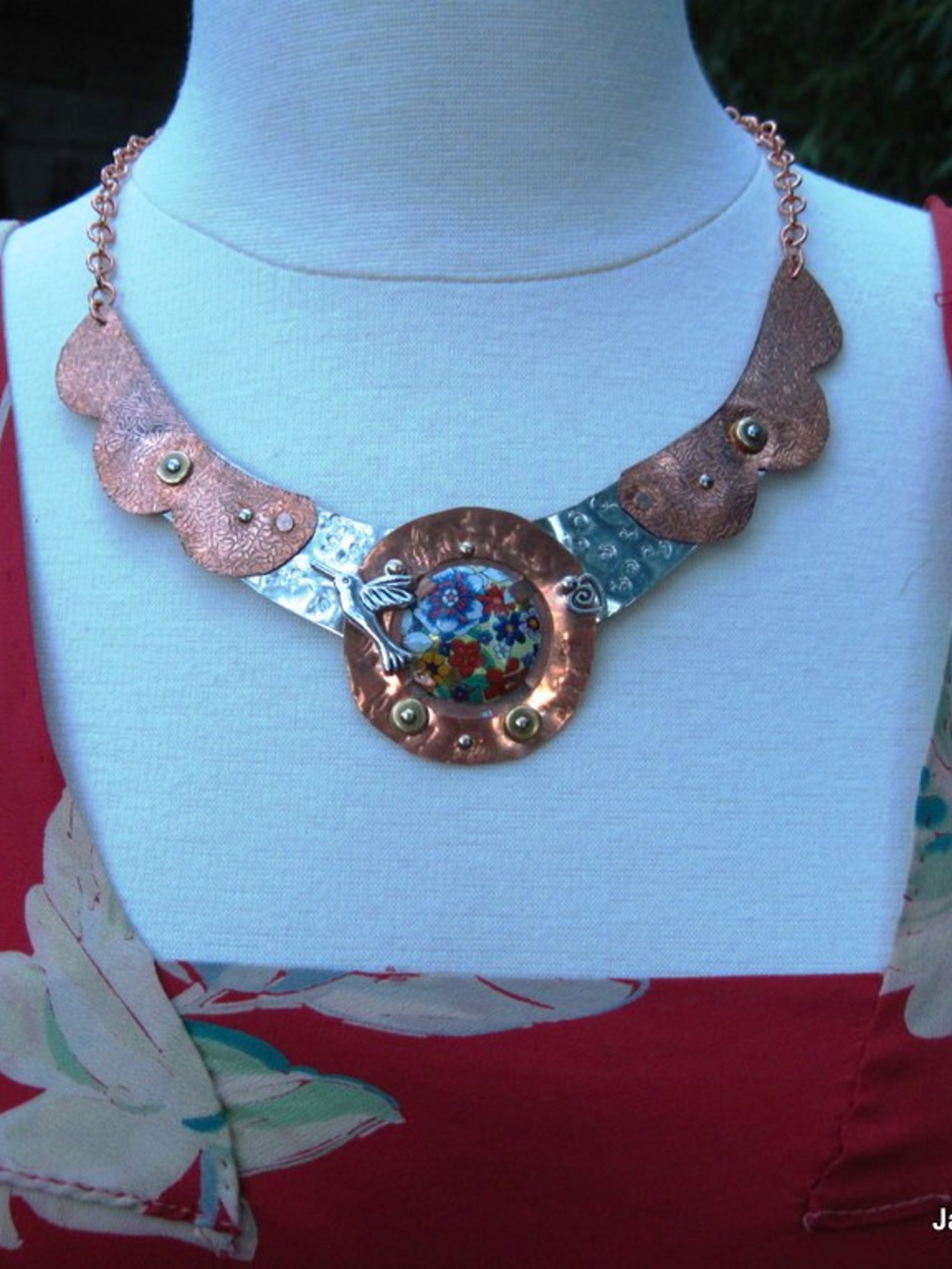 Winged breastplate is made of copper and German silver sheet metal. A piece of vintage recycled tin about the size of a quarter is the focal point for this statement piece. A small hummingbird and a swirling heart also adorn the front. The breast plate wings are about four inches long. The plate hangs from a copper chain finished with a lobster clasp and a two inch extension chain.