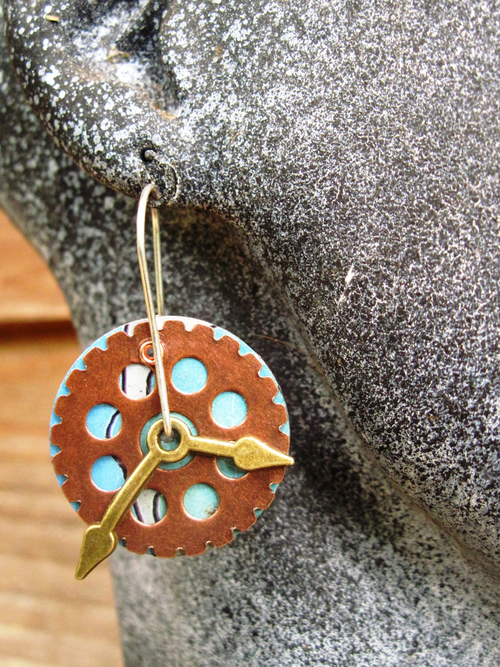 Turquoise tin from child's paint set, a gear, and clock hands have been cold connected to make these steampunk earrings. The tin disc is about an inch in diameter. The hooked ear wire comes through the center of the earring ( see photo) making the earring about one and a half inches total length. On the day of the Solstice I was inspired to make time related earrings I guess because the illusion of time changes with the planets moving around the sun.