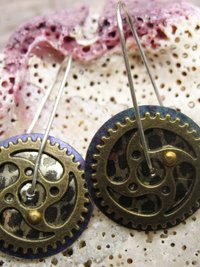 Steampunk earrings consist of a blue green tin, a leopardskin tin, and a brass gear. The parts are cold connected and they hang from a sterling silver earwire which goes through a whole in the middle of the earring and connects in the back. (see photo) The earwire hangs down about an inch and the disc section is about an inch in diameter. The entire length with earwire and disc is one and a half inches. These are fairly light weight earrings because of the tin components. They have a steampunk look but would also be great for a bicycle lover.