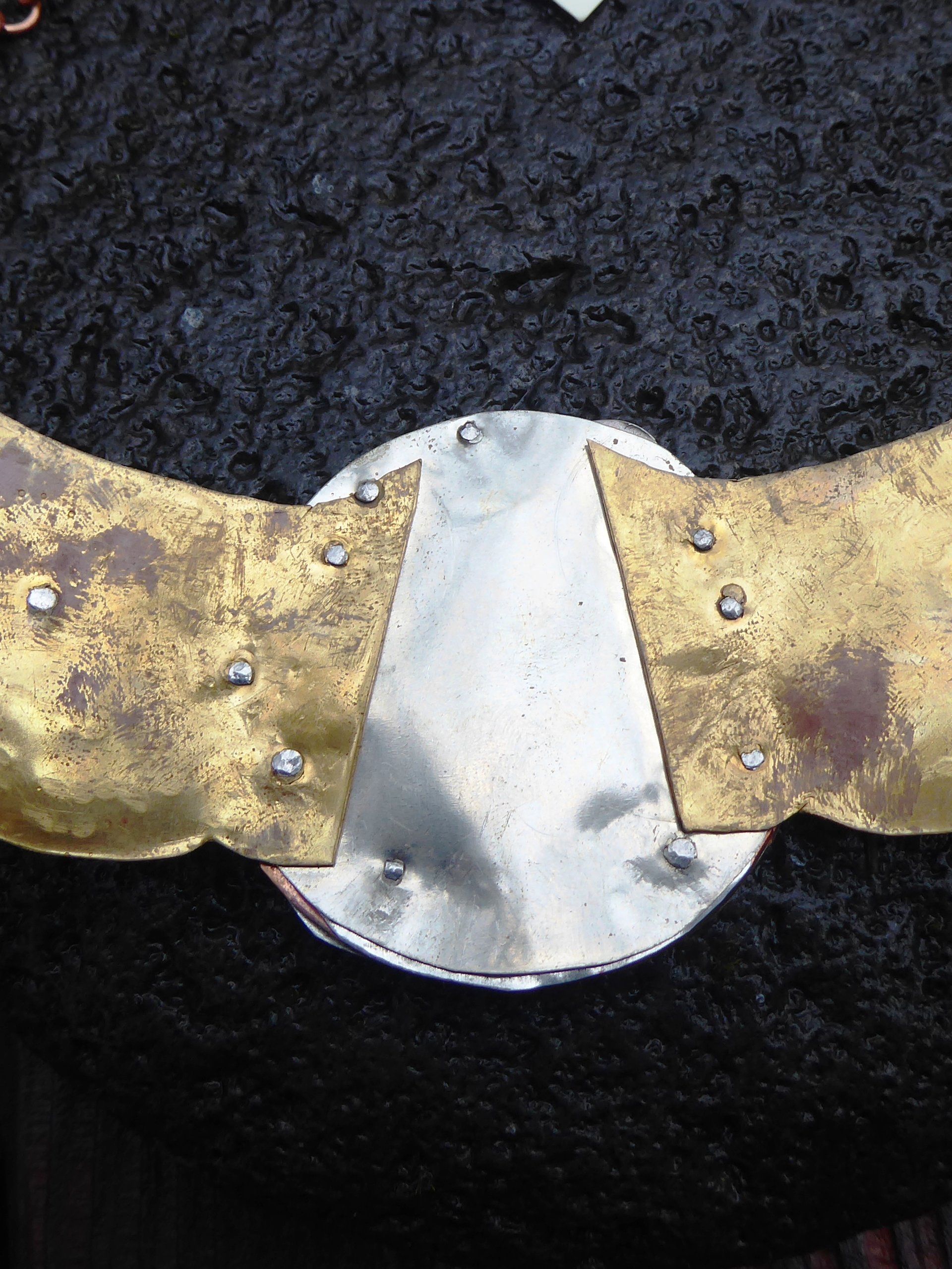 The center copper section is about two inches, The brass and German silver wings are about two inches at the top making the entire breast plate be 6 inches long.