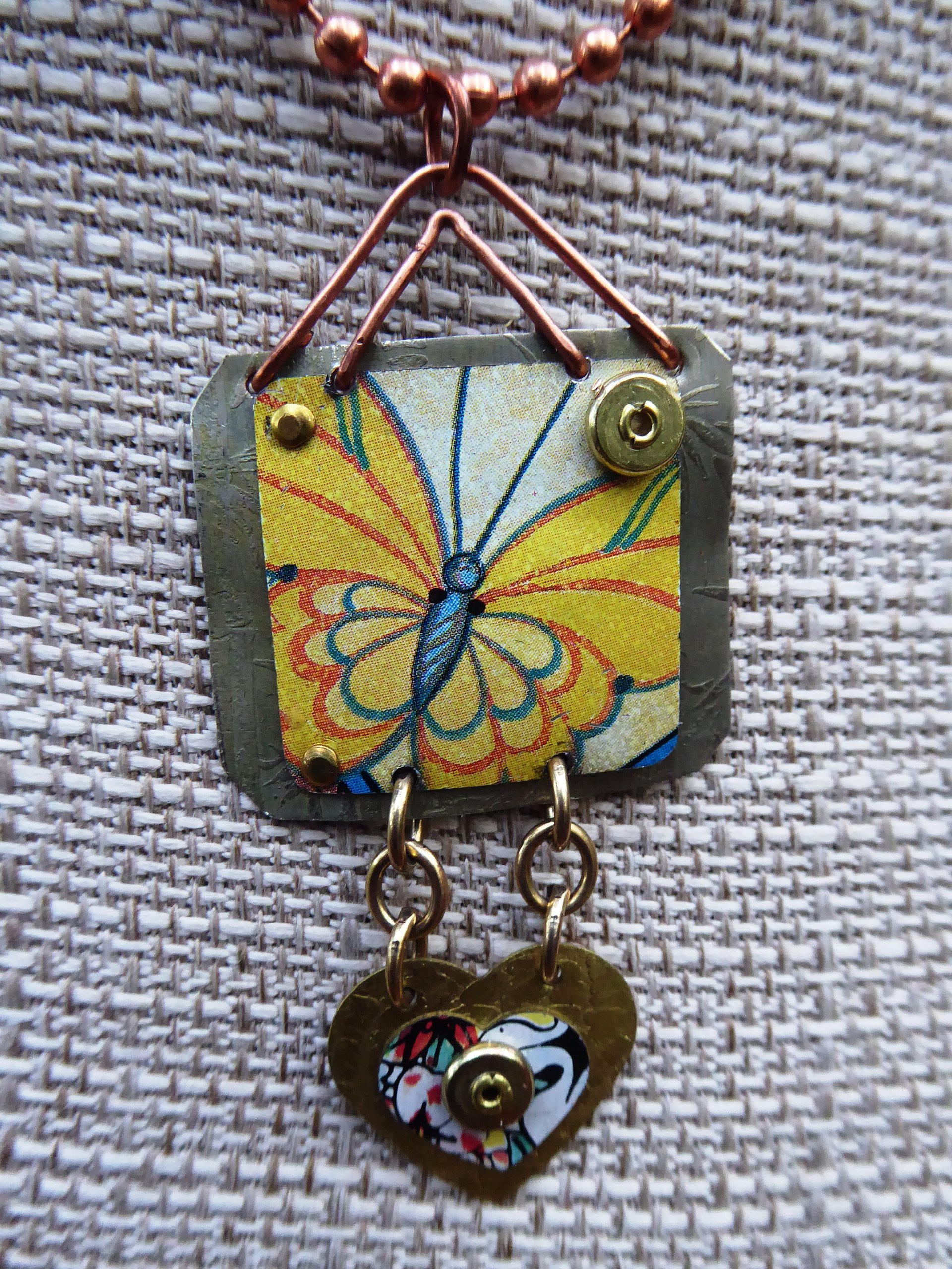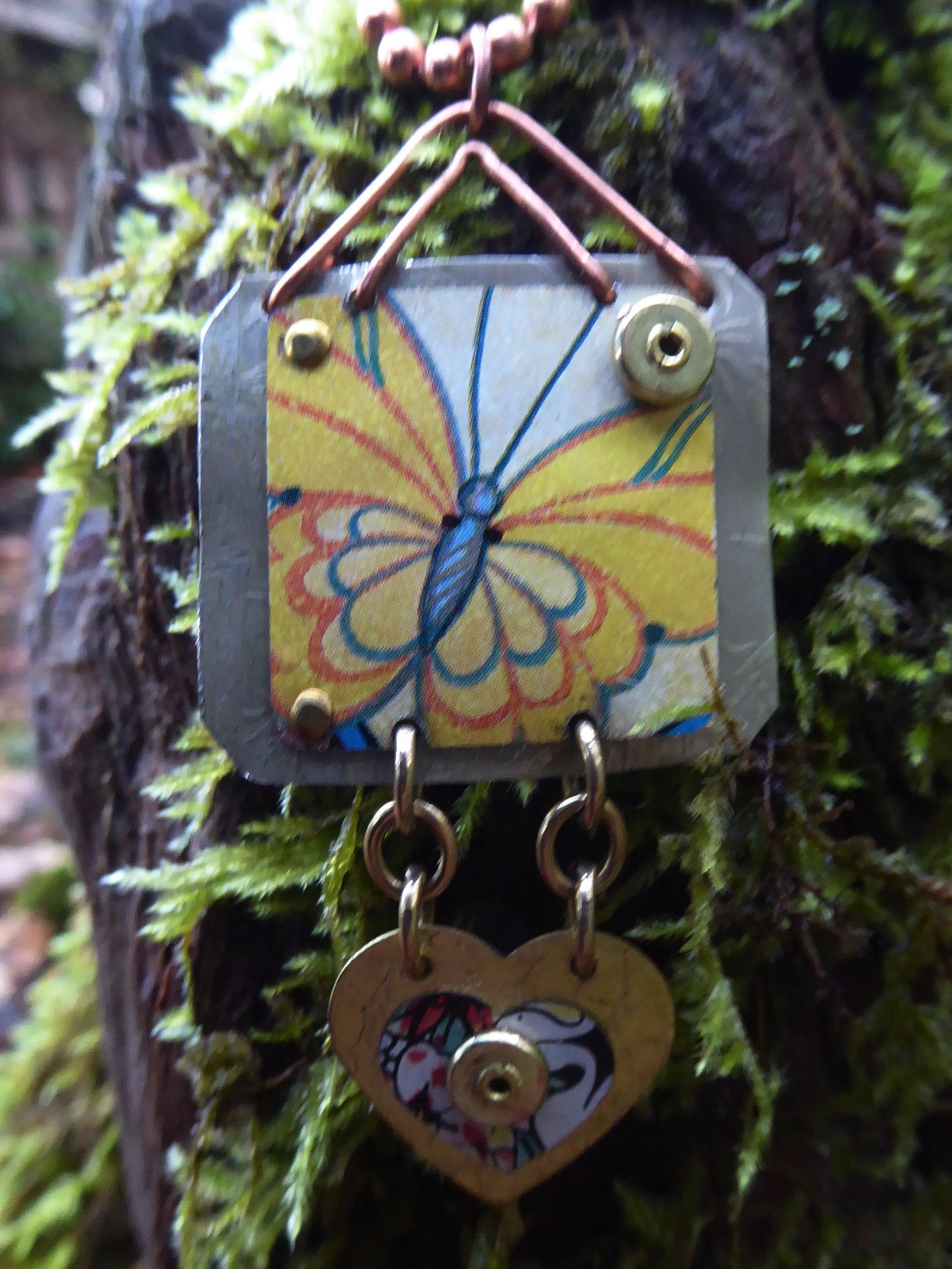 Textured nickel silver and nugold have vintage tins cold connected to them. The top nickel portion is a tin of a butterfly and the bottom heart has a flower tin covering the metal. The pendant is about an inch and a quarter wide by about three inches long. This tin is one of a kind and all the materials are recycled except for the chain. The chain is a ball chain of copper and you will decide the length you prefer.