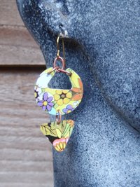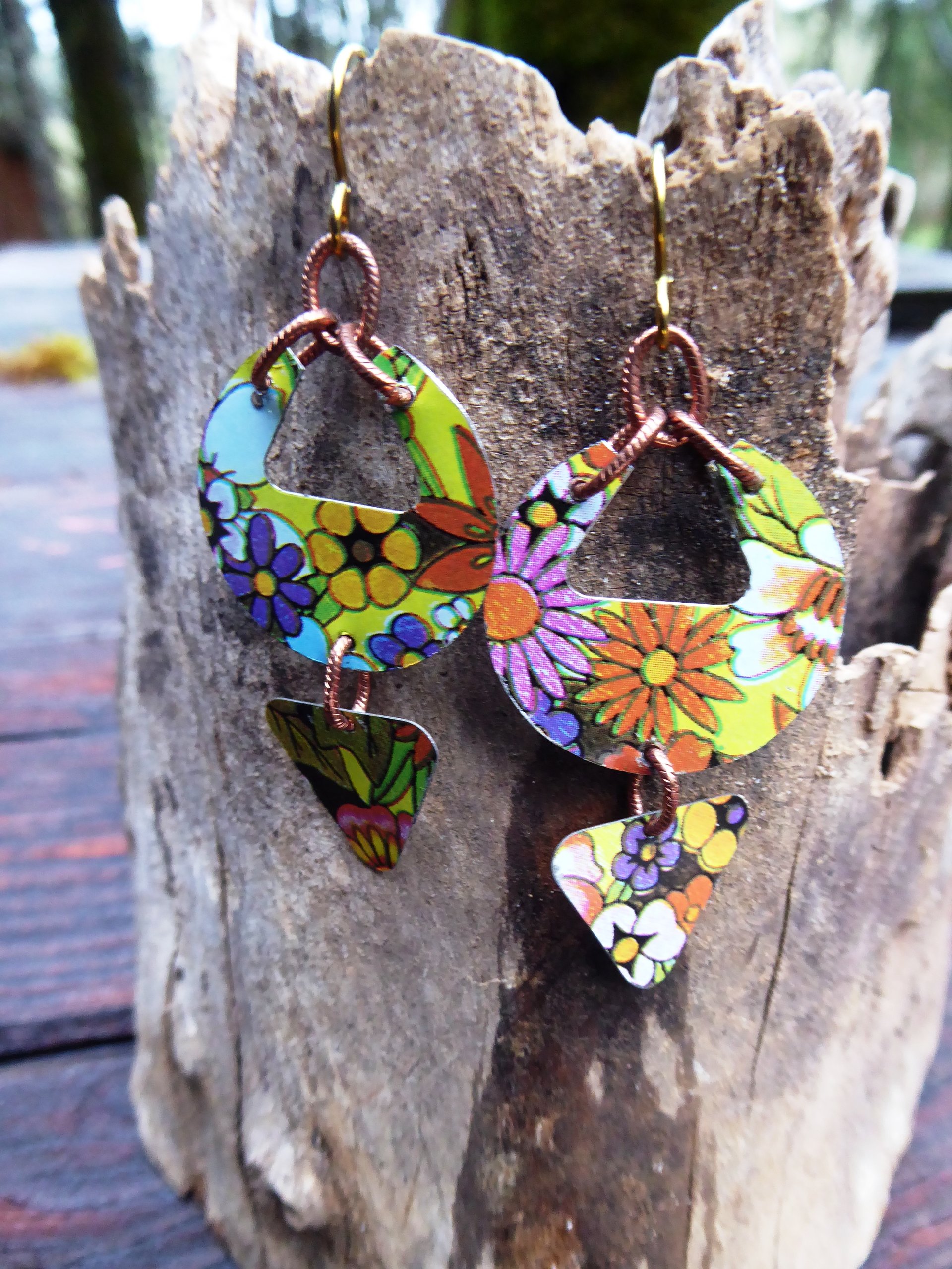 Vintage floral tea tin which is one of my favorites has been re purposed to make these large dangle tin earrings. Tin makes great earrings because they can be long and still are incredibly light weight. A floral tin that was no longer food worthy was cut into a circular shape with a peek a boo triangle on the top. A triangle hangs from the bottom as well. The components are hooked together with textured copper jump rings. These earrings show off something that was headed to the trash heap, but instead have been recycled into some wonderful one of a kind earrings.