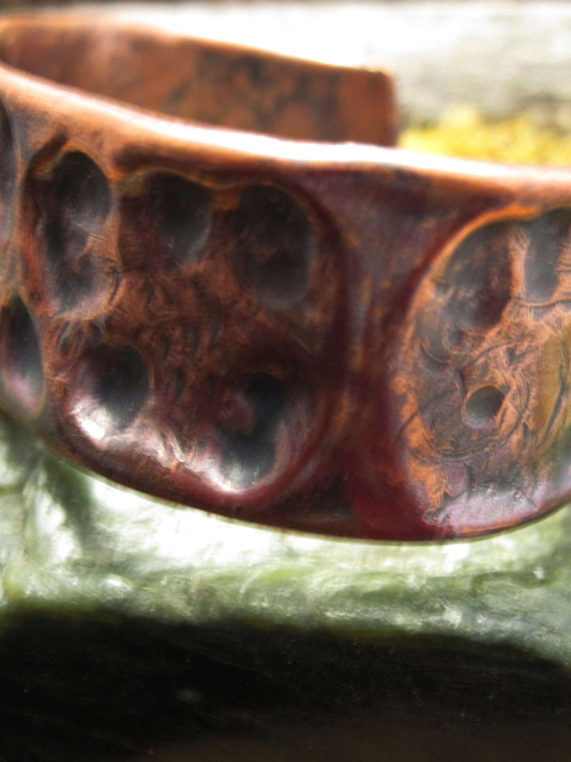 Copper has been forged to make this primitive tribal fold form pendant. The technique for this cuff is called air chasing. The metal is heated and hammered numerous times to get the desired texture. The cuff is of a heavy guage so there is some weight to it.