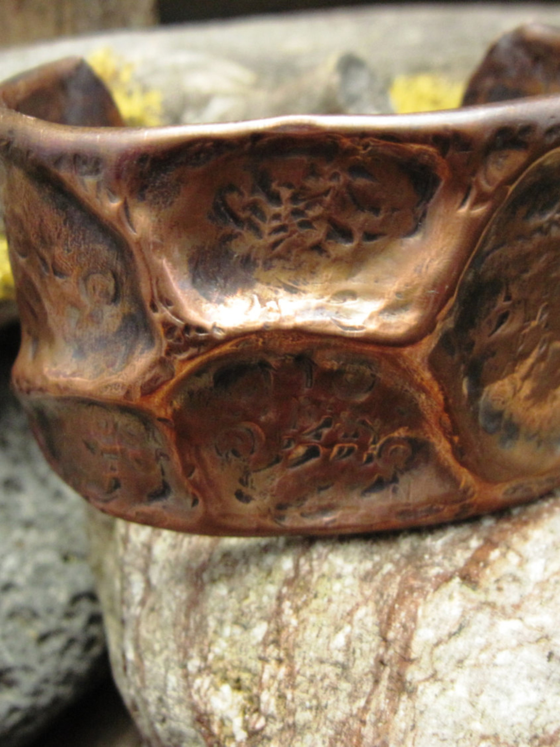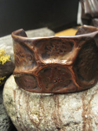 Extra wide forged foldform tribal bracelet is very organic in nature and makes a statement. Cuff was created by air chasing copper so it has been heated and hammered numerous times. The metal is of a heavy gauge so the cuff has some heft to it.